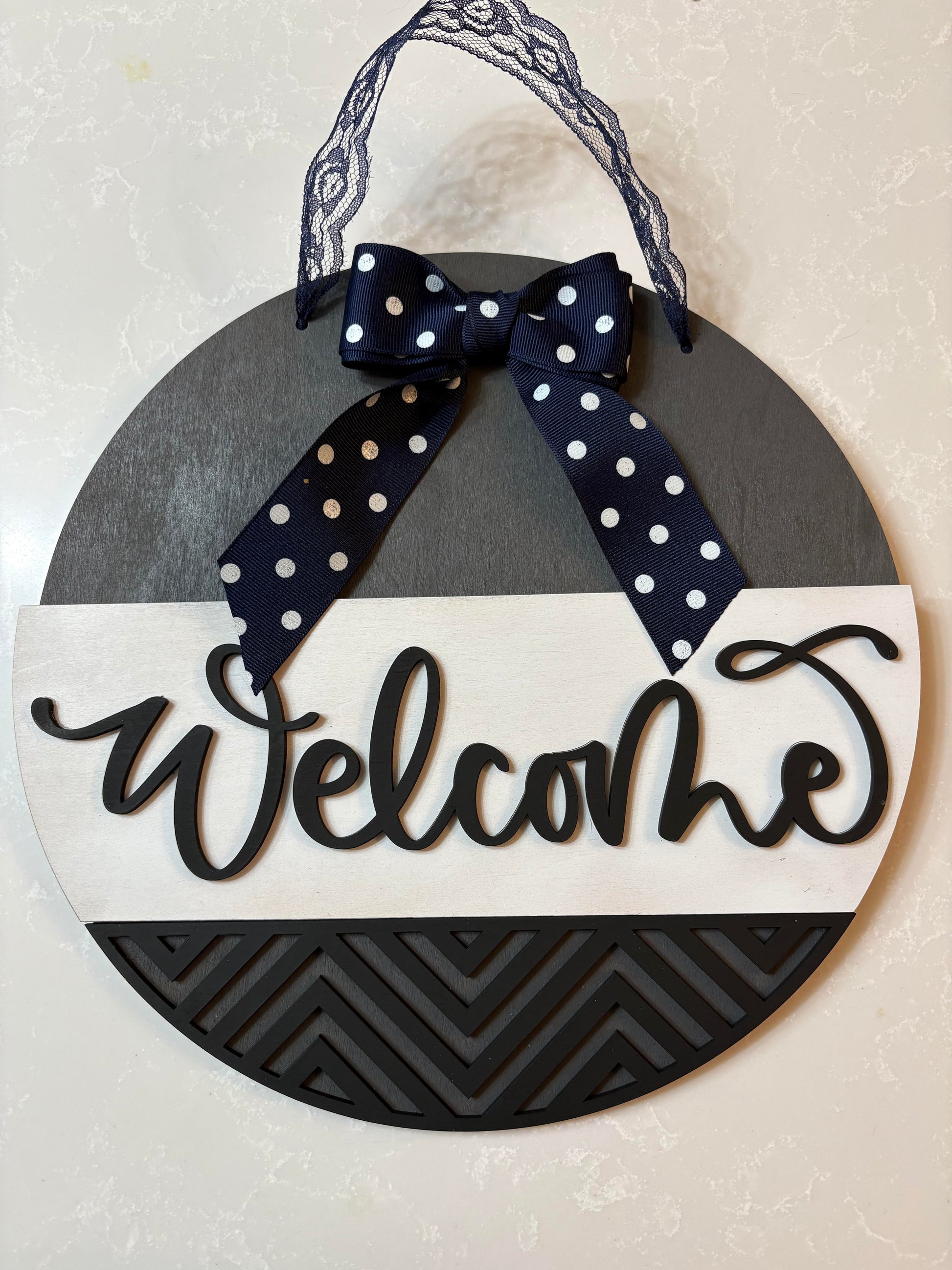 Come on in! This black and white wooden welcome sign is the perfect addition to your front door. Includes cute polka dot ribbon.